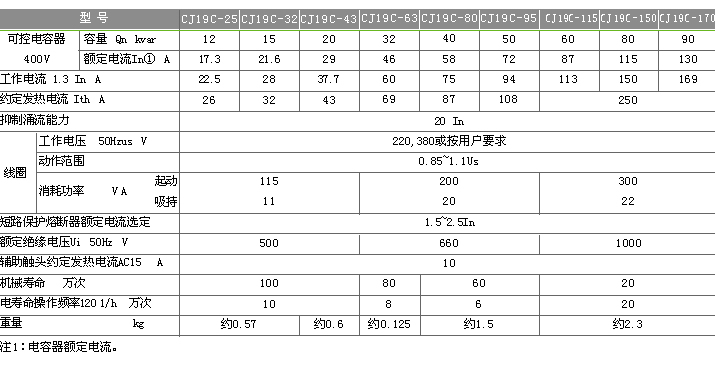 400V容量 Qn kvar1215203240506080额定电流 In③ A17.321.62946587287115工作电流 1.3 In A22.52837.7607594113150约定发热电流 Ith A2632436987108 抑制涌流能力20 In线圈工作电压 50Hz Us V220,380或按用户要求动作范围0.85~1.1 Us消耗功率 VA (1):起动 (2): 吸持115,11200,20300,22短路保护熔断器额定电流选定1.5~2.5 In额定绝缘电压 Ui 50Hz V115,1500 166601000辅助触头约定发热电流 AC15 A10机械寿命 万次100 6020电寿命操作频率 120 I/h 万次